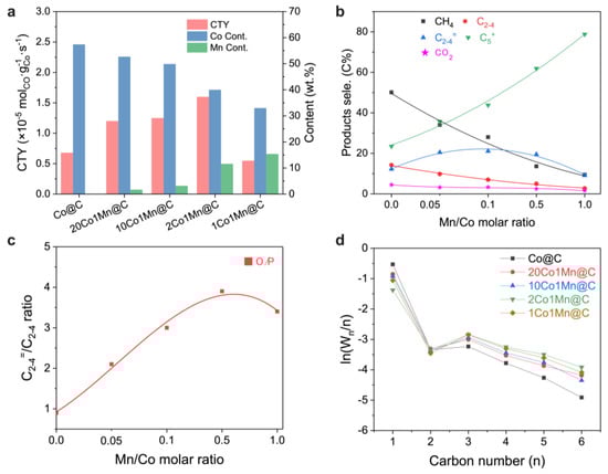 The product selectivity of CH4, C2–C4, and C5+, as well as the C2–C4 olefin/paraffin ratio (O/P), is presented in Figure 1b,c. With an increase in the Mn/Co molar ratio from 0.0 (Co@C) to 1.0 (1Co1Mn@C), the incorporation of Mn significantly inhibits the production of CH4, CO2, and C2–C4 paraffin accompanied by an enhancement in the C5+ selectivity. Accordingly, methane selectivity decreases from 50.1% to 9.4%, and selectivity towards long C5+ ranges from 23.5% over Co@C to 78.8% over 1Co1Mn@C. Meanwhile, the C2–C4 olefin (C2–4=) selectivity first increases and reaches a selectivity plateau along with Mn addition. The C2–4= selectivity on 10Co1Mn@C (21.1%) and 2Co1Mn@C (19.5%) is almost two-fold higher than that of unpromoted Co@C catalysts (12.2%). A further increase in the Mn loading to 15.4 wt.% (1Co1Mn@C) gives rise to a decrease in C2–4= selectivity, and thus the olefin/paraffin ratio (O/P) value increases and peaks in the 2Co1Mn@C sample. Moreover, the product distribution (Figure 1d) shifts to longer hydrocarbons with the increase in Mn loading, implying an increase in the chain growth probability (α). The intrinsic activity is usually affected by the nature of the catalyst’s surface structure and the electronic interaction between the catalytic surface and the supports or additives. We thus examined the active surface areas, electronic interactions with additives, and surface structures of these catalysts.