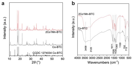 (a) XRD patterns and (b) IR spectrum of Co-BTC and 2Co1Mn-BTC precursors.