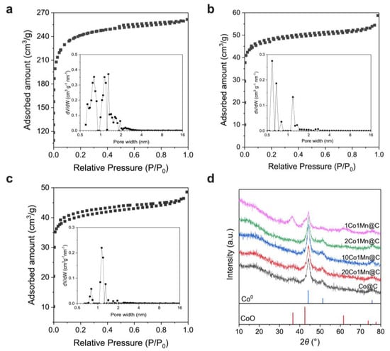 From the N2 sorption measurements at −196 °C, it was observed that the Co@C samples exhibited a Brunauer–Emmett–Taller (BET) surface area of 169.7 m2/g. The MOF-derived FTS catalysts that we have prepared here come from the direct pyrolysis of the MOF precursors and thus contain a very high weight percentage of cobalt in the final catalysts (57.36 wt.% for Co@C). The high cobalt content in the MOF-derived FTS catalysts contributes to the observed modest surface areas. Moreover, the surface areas of the BMOF-derived CoMn@C composites were related to the Mn/Co molar ratio, as listed in Table S2; the surface area decreased from 148.0 m2/g to 125.5 m2/g when increasing the Mn content from 3.2 wt.% (10Co1Mn@C) to 11.6 wt.% (2Co1Mn@C). As shown in Figure 3a–c, all the Co@C and CoMn@C composites derived from Co-MOF and CoMn-MOF exhibited a type I(b) isotherm with a H4 type hysteresis loop according to the IUPAC classification. The high uptake at low pressure and small hysteresis loop indicate that there is a large number of micropores in the MOF-derived catalysts’ particles. From the pore size distribution (illustration), it was observed that the MOF-derived Co@C, 10Co1Mn@C, and 2Co1Mn@C presented similar micropore distributions. Therefore, the rapid deactivation during the initial stages of the reaction (Figure S1) could be related to the diffusional limitations caused by the initially smaller pores within the MOF-derived catalysts, which were filled by the liquid waxes generated under the reaction conditions. Moreover, the introduction of Mn narrowed the pore distribution and significantly reduced the number of pores with a diameter of less than 1 nm. We speculate that the reason for this is that the formation of MnO species restrains the shrinkage and collapse of the pore in the carbon matrix during the pyrolysis process.