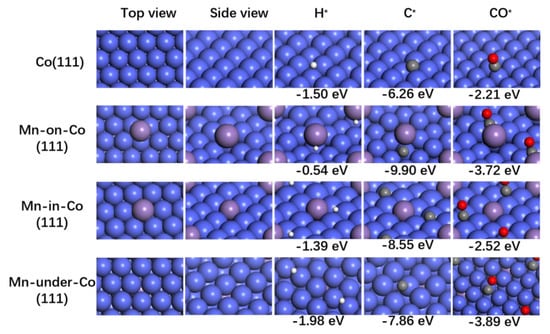 To understand the activity and product selectivity of FTS on MOF-derived composites’ catalytic surfaces, DFT calculations were performed to evaluate the promotion effect of Mn in catalysis and the possible position of Mn. As the XPS results revealed the enrichment of Mn on the catalyst’s surface, three Mn-modified models were chosen with Mn at the surface (Mn-on-Co) and subsurface (Mn-in-Co), as well as embedded in the Co lattice (Mn-under-Co). For simplicity, Mn species were modeled as Mn0 rather than MnO for our DFT calculations [,]. Therefore, the adsorption binding energies of H, C, and CO species were calculated on the surfaces of Co(111), Mn-on-Co(111), Mn-in-Co(111), and Mn-under-Co(111), respectively. As shown in Figure 6, the calculated adsorption energies on clean Co(111) are in reasonable agreement with the values reported in the literature [,]. Interestingly, Mn-on-Co(111), Mn-in-Co(111), and Mn-under-Co(111) all lead to higher binding energies for CO. Meanwhile, the effect is stronger for Mn-on-Co(111) compared with the clean Co(111) surface, with changes in the adsorption energies being in excess of 1 eV, but it is still significant on the Mn-under-Co surface without direct Mn–adsorbate contact.