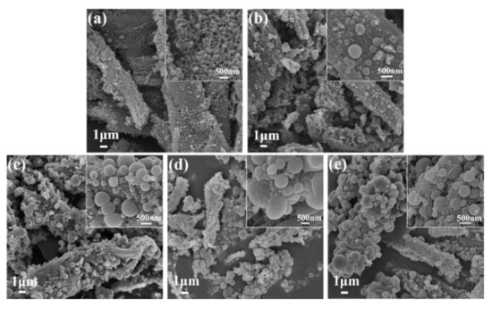 SEM images of the samples of HTC (a), HTC-N3:1 (b), HTC-N2:1 (c), HTC-N1:1 (d), and HTC-N1:2 (e).