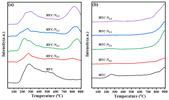 To further insight the surface chemical properties of the carbon carriers, the temperature programmed desorption (TPD) was carried out under an inert atmosphere. The TPD patterns of the carbon supports are presented in Figure 3. For the HTC sample, there was a distinct CO2 desorption peak at the temperature range of 150–650 °C, which was attributed to the decomposition of carboxylic acid and anhydride groups [53], while the four HTC-Nx samples had two CO2 desorption peaks at 150–400 °C and 700–900 °C, which could be assigned to the decomposition of carboxylic acid/anhydride groups and stable lactone groups [53]. Figure 4b displays the CO spectra of the carbon supports. The CO desorption curves of the carbon materials were similar. Distinct signals were detected at above 700 °C, which could be attributed to the decomposition of high stable phenol and quinonoid groups [54]. The TPD data further revealed the difference in the oxygen-containing groups and their distributions on HTC and HTC-Nx.