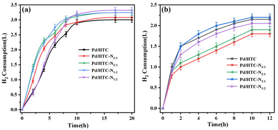 Hydrogen consumption amounts as functions of time during the hydrogenolysis reaction of TADB over Pd/HTC (a) and Pd/HTC-N1:1 (b) catalysts in the cycling experiments.