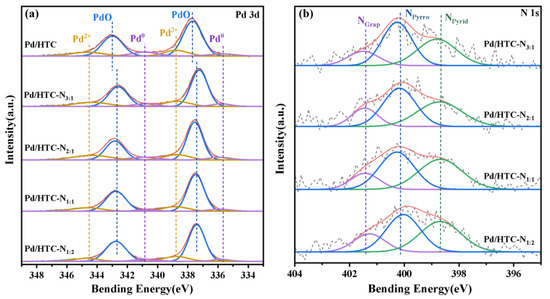 The high resolution of Pd 3d and N 1s XPS spectra of Pd/HTC, Pd/HTC-N3:1, Pd/HTC-N2:1, Pd/HTC-N1:1, and Pd/HTC-N1:2 is shown in Figure 8. The Pd 3d signals could be fitted to three pairs of peaks represented with different colors. The Pd 3d3/2 peak at around 340.8 eV, 343.0 eV, 344.6 eV, and Pd 3d5/2 peak at about 335.7 eV, 337.7 eV, and 338.8 eV were assigned to Pd0, PdO, and Pd2+ species, respectively [56,57]. A certain amount of Pd2+ ion existence reflected the strong interaction between Pd2+ and the carbon support. Considering no reducing agent existed in the preparation process, the presence of Pd0 was possibly due to electron transfer between the Pd2+ and the carbon support. The ratio of Pd0 species in the nitrogen-containing catalysts was much lower than that of the Pd/HTC sample (Table S3), suggesting that the coordination of Pd2+ to N-doped carbon made its reduction difficult [58]. The high PdO ratios demonstrated that PdO was the main form of Pd species on the catalysts (72.3–78.5%). Compared to Pd/HTC, the peak position of the PdO species on the nitrogen-containing samples moved to the low bonding energy range by 0.2–0.4 eV (Table S3). This is because the electron density of the N-doped carbon supports is higher than that of the N-free support, resulting in a reduction in the Pd oxidation state [59]. The ratios of total oxidized Pd species, PdO and Pd2+, of the nitrogen-containing catalysts were in the order of Pd/HTC-N1:1 > Pd/HTC-N1:2 > Pd/HTC-N2:1 > Pd/HTC-N3:1, which was consistent with their activities in the debenzylation of TADB, implying that oxidic Pd species might be beneficial for the debenzylation reaction.