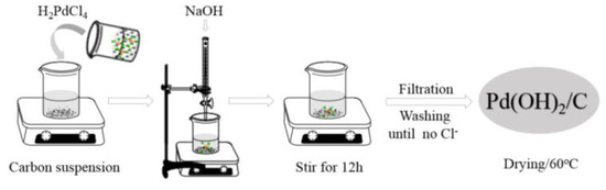The Pd(OH)2/C was prepared trough a simple deposition–precipitation method (Scheme 2). In a typical preparation, a carbon carrier (2 g) was dispersed in 20 mL deionized water through vigorous stirring to form a carbon black suspension. Meanwhile, PdCl2 (0.168 g) was dissolved in a 1 mL concentrated HCl solution and was diluted with 5 mL of deionized water to form homogeneous H2PdCl4 solution. Then, the H2PdCl4 solution was introduced to the carbon suspension. Under vigorously stirring, the NaOH solution (5 wt%) was added dropwise into the mixture until the system pH value increased up to 10. The slurry was filtered, washed extensively with deionized water until no chloride ion in the filtrate could be detected, and was dried at 60 °C overnight, providing the catalyst sample. All the catalysts were prepared under a similar condition, which were denoted as Pd/HTC, Pd/HTC-N3:1, Pd/HTC-N2:1, Pd/HTC-N1:1, and Pd/HTC-N1:2, respectively, according to the support names.