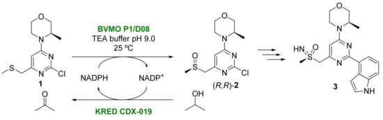 One example has been recently shown in the BVMO-catalyzed sulfoxidation step in the synthesis of AZD6738 (3), a candidate drug for the treatment of colon and hematological cancers []. This drug presents a chiral sulfoximine moiety in its structure, which is obtained from sulfoxide (R,R)–2. The initial synthesis of 2 from its prochiral sulfide 1 is carried out by employing m-chloroperbenzoic acid, which requires a chromatographic separation of the diasteromers obtained, yielding 50% of the desired sulfoxide as the highest yield. The application of the Kagan procedure in the presence of a titanium catalyst, afforded 2 in low yields, with degradation products. For these reasons, the biocatalytic approach for the oxidation of 1 was applied []. Reaction optimization was carried out using the design of experiments (DOE), analyzing the effect of substrate and enzyme concentrations, cosolvent charge, the type of buffer, and enzyme type. After analyzing more than 100 BVMOs, the best results were obtained with BVMO P1/D08 from the company Codexis in triethanolamine (TEA) buffer at pH 9.0, obtaining a 94% conversion starting from a sulfide concentration of 40 g/L and a BVMO loading of 24% weight (Scheme 3). The reaction was scaled up to the kilogram scale, analyzing all the parameters that could affect the process. Thus, an efficient agitation (500 rpm) and gas-liquid mass transfer (stream of air to supply O2 to the reaction) were required, as well as successive additions of iso-propanol (IPA), which was employed as cosolvent and cosubstrate to regenerate the cofactor NADPH in combination with the KRED CDX-019 to offset evaporation. Enzyme loading could be optimized up to 5% weight, achieving a 77% isolated yield after a one-day reaction. A further development in the biocatalyzed process was performed by carrying out the oxidations at higher scale (60 kg batches), leading to a 74% yield of the chiral sulfoxide with >99% enantiomeric excess (ee), which improves to a great extent the precedent chemical-synthesis protocols and increases the sustainability of the process.