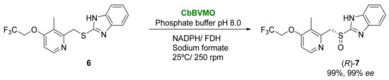 (R)-Lansoprazole (7) is also a valuable PPI, but the different attempts to obtain this enantiomerically pure API through biocatalytic methods were unsuccessful. In 2018, two Baeyer-Villiger monooxygenases, one from Bradyrhizobium oligotrophicum (BoBVMO) and the other from Aeromicrobium marinum (AmBVMO), were employed to catalyze its formation starting from the lansoprazole sulfide with high selectivity []. These biocatalysts were also able to catalyze the formation of other prazoles, including omeprazole, rabeprazole, pantoprazole, and ibaprazole. A further improvement in the biocatalytic preparation of (R)-lansoprazole from its prochiral sulfide 6 was established in 2022 []. After analyzing different biocatalysts, the BVMO form Cupriavidus basilensis (CbBVMO) showed the highest activity and selectivity in this oxidative procedure. This BVMO can convert 10 mM of the starting material to (R)-lansoprazole completely and with 99% ee after 35 h of employing the sodium formate/FDH system for the regeneration of the NADPH cofactor (Scheme 5). The excellent selectivity featured by the catalyst and complete conversion in the reaction were also observed for the formation of other prazoles, including (R)-omeprazole, (R)-pantoprazole, and (R)-raboprazole, but the biocatalyst is still being improved in order to achieve higher catalytic efficiencies that will allow the application of this process at an industrial level.