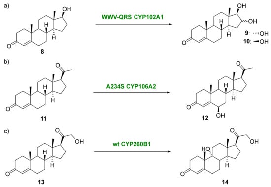 CYP-catalyzed hydroxylations of steroids. (a) Selective oxidation of testosterone (8); (b) Biooxidation of progesterone (11), and (c) Biocatalyzed hydroxylation of cortodoxone (13).