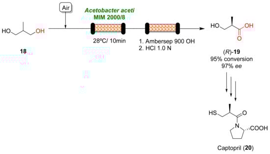 Furthermore, the manufacture of APIs on an industrial scale has been recently improved by employing continuous flow synthesis. This allows a larger scale production with better atomic efficiency, in addition to facilitating the automation of the synthetic process [,,,]. One example has been recently shown in the preparation of captopril (20), an angiotensin-converting enzyme inhibitor employed for the treatment of hypertension []. This API was discovered and developed at E. R. Squibb & Sons Pharmaceuticals in the 1970s and is still prescribed []. In 2021, Romano et al. designed a synthetic route under continuous flow for captopril synthesis in which the first reaction was a biocatalytic oxidation followed by three chemical transformations until the enantiomerically pure active ingredient was obtained, as shown in Scheme 8 []. The oxidation of commercially available diol 18 was carried out using a continuous flow of 1.0 g/L of starting diol in an acetate buffer of pH 6.0 catalyzed by Acetobacter aceti MIM 2000/28, an acetic acid bacterium. These types of bacteria can perform the chemo-, regio-, and stereo-selective oxidation of primary alcohols, affording the corresponding carboxylic acids with good yields, while aldehydes were not normally isolated []. The biocatalyst was immobilized by entrapment in dry cells of alginate. After this, it was packed into a glass column with an inner diameter of 15 mm and swelled by passing buffer through the column. The air supply was maintained using an air-liquid flow stream. After 10 min, carboxylic acid 19 was recovered with 95% conversion and 97% enantiomeric excess. By employing 400 mg of the immobilized enzyme, around 50 mL was collected, achieving the highest conversion rate in the first 35 mL. In order to recover the final product, a catch-and-release system was employed using an Ambersep 900 OH resin-packed column in which the acid was entrapped, and afterwards, eluted by treatment with HCl 1.0 N.