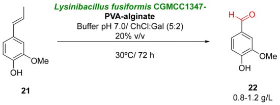 Vanillin (4-hydroxy-3-methoxybenzaldehyde) is one of the most used flavors in the world, but apart from this use, it has been also employed in the pharmaceutical and medical industries as it displays antioxidant, neuroprotective, and anticancer activities []. In 2017, different Deep Eutectic Solvents (DESs) were employed as cosolvents (1% v/v) in the conversion of isoeugenol (21) into vanillin (22) in a process catalyzed by Lysinibacillus fusiformis CGMCC1347 cells []. DESs are liquids prepared by mixing a hydrogen-bond donor with a hydrogen-bond acceptor (generally a quaternary amine) at a precise molar ratio at about 80 °C. The liquid formed maintains its state, presenting valuable properties as (co)solvents in catalysis. These compounds are prepared with a complete atom economy, being biodegradable, cheap, and having high thermal stability [,].