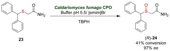 Armodafinil is a potent drug used as a treatment for fatigue in narcolepsy, sleep apnea, and sleep disorders [,]. It is the isomer (R) of the racemic compound, modafinil (24), which has the longest duration of both enantiomers due to a slower metabolism and excretion, resulting in a longer time of action. The group, Jiang et al., reported an enantioselective synthesis of (R)-modafinil using a chloroperoxidase (CPO) in an oxidative process (Scheme 10) []. These heme-dependent enzymes are capable of catalyzing halogenation reactions of organic compounds by generating reactive hypohalites in the presence of halides and hydrogen peroxide; while in the absence of the corresponding halides, CPOs are able to participate in several oxidative procedures, including hydroxylations, epoxidations, or sulfoxidations []. Thus, the sulfoxidation of 2-(diphenylmethylthio)acetamide (23) using CPO from Caldariomyces fumago as a oxidative catalyst and tert-butyl hydrogen peroxide (TBPH) as oxidizing agent in an aqueous buffer of pH 5.5 afforded (R)-modafinil with an 11% yield and 97% ee. This low yield is due to the low solubility of the compound 23 in an aqueous medium. For this reason, ionic liquids (ILs), quaternary ammonium salts (QAS), and polyhydroxylated compounds were employed as additives to increase the substrate solubility []. All of these compounds had a positive effect on the biocatalyzed system, making it possible to achieve a 41% (R)–24 when employing the ionic liquid, 1-ethyl-3-methylimidazolium bromide ([emim]Br), while maintaining the sulfoxide’s optical purity.