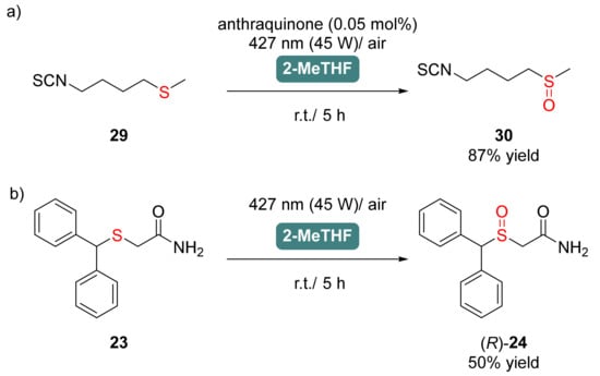 In 2022, Skolia et al. described a mild and sustainable methodology for the photochemical oxidation of sulfides to sulfoxides in the presence of molecular oxygen []. This methodology was further improved by combining the photochemistry approach for the light-mediated oxidation of sulfides with the use of a biobased solvent such as 2–MeTHF. This novel method was further applied to the preparation of two sulfoxides with pharmaceutical properties (Scheme 12) []. The first of these was sulforaphane (30), a compound which exhibits anticancer properties and demonstrated potential as an inhibitor of SARS-CoV-2 following in vitro replication []. Authors consider that they have achieved more industry-friendly results by employing LED 427 nm and anthraquinone at low loading (0.05 mol%) as a catalyst in the photooxidation of sulfide 29. After 5 h, an 87% yield of the desired sulfoxide was obtained. Another remarkable outcome is the synthesis of armodafinil (24). In this case, starting sulfide 23 presented an active benzylic position in its structure, which complicates the chemoselective photochemical-oxidation protocol when applying LED 427 nm. In fact, the use of an anthraquinone-mediated photochemical protocol, even at very low catalyst loadings, leads to the decomposition of the intermediate, which is attributed to a C–S bond fragmentation in the highly reactive benzylic position. Fortunately, authors avoid this unwanted reaction by using catalyst-free conditions, affording modafinil with a 50% yield after 5 h.