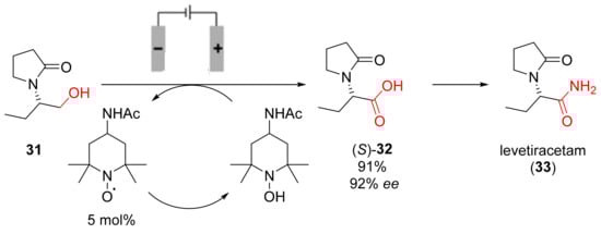 Electrochemical oxidations also provide an attractive alternative to the more traditional chemical methods []. Applying this technique, Stahl et al. have recently described the aminoxyl-mediated oxidation of alcohols and aldehydes to the corresponding carboxylic acids []. Using this procedure, the effective synthesis of the carboxylic acid precursor 32 of levetiracetam (33), catalyzed by 4-acetamido-2,2,6,6-tetramethylpiperidin-1-oxyl (ACT), should be highlighted (Scheme 13). Levetiracetam is a generic drug used to treat epilepsy and is potentially beneficial for other central nervous system disorders like Alzheimer’s disease and autism []. The use of 5 mol% ACT in an aqueous medium, applying a potential of 0.7 V vs. Ag/AgCl and a 1.1 equivalent of NaHCO3 as the electrolyte (pH 8.5) in a 40 g scale of alcohol 31, afforded the desired compound 32 with a 91% yield and 92% ee.