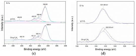 In order to determine the elemental composition and chemical bond of g-C3N4 and CA-g-C3N4, g-C3N4 and CA-g-C3N4 were characterized by XPS, and the results are shown in Figure 3. Figure 3a is a survey of g-C3N4 and CA-g-C3N4. In the figure, the composition of g-C3N4 and CA-g-C3N4 is the same, which indicates that the addition of citric acid did not change the composition of g-C3N4. Figure 3b is the C 1s of g-C3N4 and CA-g-C3N4. The two fitting peaks of g-C3N4 are 287.54 and 284.80 eV, respectively. The two fitting peaks of CA-g-C3N4 are 288.11 and 284.80 eV, respectively, which correspond to N–C=N and C–C in the triazine ring. Figure 3c is the N 1s picture of g-C3N4 and CA-g-C3N4. G-C3N4 has four peaks, which are 398.06, 399.48, 400.52 and 404.00 eV, respectively. CA-g-C3N4 corresponds to 398.61, 400.14, 401.21 and 404.18 eV, respectively, and C–N=C, N–C3, C–N–H and Π-excitation [44]. Figure 3d shows the O 1s of g-C3N4 and CA-g-C3N4, corresponding to 531.89 and 532.50 eV. It can be seen from the XPS results that the addition of citric acid had no effect on the composition and chemical bonds of g-C3N4.