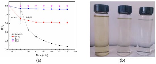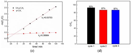 The performance of photocatalyst g-C3N4 and CA-g-C3N4 was tested using UV-visible spectrophotometry to measure the absorbance of Cr(VI) before and after the reaction, and the removal effect of Cr(VI) was judged by calculation. The test method of this experiment was as follows: 100 mL Cr(VI) solution with a concentration of 20 mg·L−1 and a pH value of 2 was prepared in advance and placed in a quartz reactor; 50 mg photocatalyst g-C3N4 or CA-g-C3N4 was added; a rotor was added into the solution and it was stirred through magnetic force to make it evenly mixed. At room temperature, the solution was stirred in the dark for 30 min to achieve adsorption–desorption equilibrium between the solution and the photocatalyst so as to facilitate the subsequent judgment of the photocatalytic activity of the photocatalytic materials. After dark reaction for 30 min, the UV light source was turned on to irradiate the solution, and the water circulation was turned on to control the reaction temperature. When the total irradiation time of the UV lamp was 20, 40, 60, 80, 100 and 120 min, respectively, 2 mL of the reaction solution was taken out, filtered with a biofiltration membrane and 0.5 mL of the filtered solution was taken out for absorbance testing. The solution was not put back each time after removal. According to the absorbance of the solutions obtained at different time periods, the corresponding solution concentration could be calculated, and the above solution concentration and the original solution concentration could be calculated to obtain the removal effect of Cr(VI) in water at each time period by the photocatalyst.