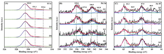 The XPS technique was used to analyze the surface oxygen species and element compositions of the samples. Figure 3 shows O 1s, Pd 3d, and Au 4f XPS spectra of the samples, and their quantitative analysis results are summarized in Table 1.