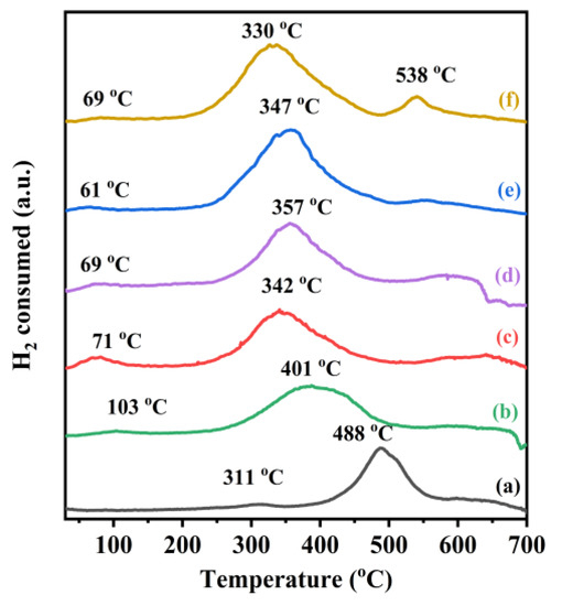 H2-TPR profiles of (a) TiO2, (b) 0.36Au/TiO2, (c) 0.33Pd/TiO2, (d) 0.35AuPd0.46/TiO2, (e) 0.34AuPd2.09/TiO2, and (f) 0.37AuPd2.72/TiO2.