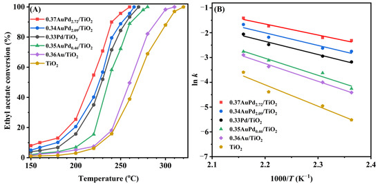 The kinetic results of ethyl acetate oxidation reveal that under the oxygen-enriched conditions, the oxidation of ethyl acetate follows a first-order toward the concentration of ethyl acetate [53]. Therefore, it is anticipated that ethyl acetate oxidation under oxygen-rich conditions (ethyl acetate/O2 molar ratio = 1/200) can be considered to follow the first-order reaction kinetics toward ethyl acetate concentration as follows: r = −kc = −Aexp(−Ea/(RT))c, where r, A, k, and Ea are the reaction rate (mol/s), pre-exponential factor, rate constant (s–1), and apparent activation energy (kJ/mol), respectively. The k value can be calculated using the reaction rates and reactant conversions at various temperatures. Figure 5B shows the Arrhenius curves for the oxidation of ethyl acetate over the samples at an SV of 40,000 mL/(g h), and Table 2 lists the apparent activation energies (Ea). The Ea value increased in the sequence of 0.37AuPd2.72/TiO2 (37 kJ/mol) < 0.34AuPd2.09/TiO2 (42 kJ/mol) < 0.33Pd/TiO2 (44 kJ/mol) < 0.35AuPd0.46/TiO2 (57 kJ/mol) < 0.36Au/TiO2 (60 kJ/mol) < TiO2 (72 kJ/mol). It has been widely known that the lower the Ea value, the easier the reaction proceeds. The 0.37AuPd2.72/TiO2 sample possessed the lowest Ea value, further demonstrating that this sample showed the maximal catalytic activity for oxidizing ethyl acetate.
