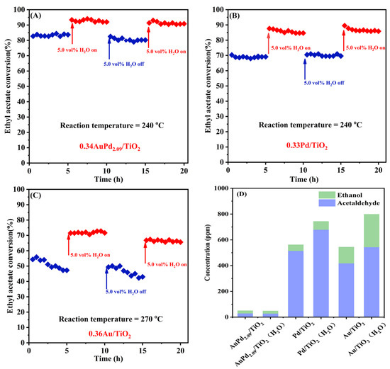 Since exhaust gas frequently contains water vapor under actual working circumstances, and furthermore, water is also one of the products of VOCs oxidation, it is hence necessary to examine the high-temperature stability and water resistance of the typical samples. Figure 7 shows the influence of water vapor on the catalytic activity and selectivity of the 0.34AuPd2.09/TiO2, 0.33Pd/TiO2, and 0.36Au/TiO2 samples for ethyl acetate oxidation at SV = 40,000 mL/(g h). The 0.34AuPd2.09/TiO2 and 0.33Pd/TiO2 samples possessed good stability in the absence of water, whereas the 0.36Au/TiO2 sample was less stable. After the introduction of 5 vol% water vapor, the catalytic ethyl acetate oxidation activity of each sample showed a boosting effect, and the conversion of ethyl acetate was improved by about 10, 15, and 14%, respectively. Ethyl acetate conversions over the 0.34AuPd2.09/TiO2 and 0.33Pd/TiO2 samples were restored to their initial levels after the supply of H2O was cut off; however, the activity of 0.36Au/TiO2 declined by around 5%, which was associated with its poor stability. The distributions of the major byproducts before and after the introduction of water were compared, as shown in Figure 7D. It was evident that more by-products were produced with the addition of water, in which there was a slight rise in the amount of by-products over 0.34AuPd2.09/TiO2, an increase in the amount of acetaldehyde over 0.33Pd/TiO2, and increases in the amounts of acetaldehyde and ethanol over 0.36Au/TiO2.