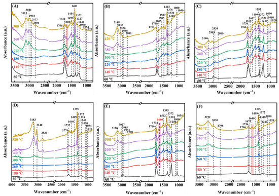 Moreover, we applied the in situ DRIFTS technique to further probe the surface species generated and their alterations during the oxidation of ethyl acetate over the samples. The gas mixture used in the in situ DRIFTS study was the same as that utilized in the activity assessment. After the samples were activated in the oxygen flow for 1 h, in situ DRIFTS spectra of the adsorbed species on the surface of the 0.33Pd/TiO2, 0.34AuPd2.09/TiO2, and 0.36Au/TiO2 samples were recorded at different temperatures, as shown in Figure 10. At 60 °C, the vibration absorption bands at 1060 and 1240 cm−1 corresponded to the ethyl acetate C−O stretching vibrations (v(C−O) and ν(CO)) [48], the ones at 1375 and 1454 cm−1 were assigned to the symmetric bending vibration (δs(CH3)) and asymmetric bending vibration (δas(CH3)) of methyl, respectively. The band at 1734 cm−1 was ascribed to the C−O stretching vibration ((νasC=O)) of ethyl acetate, and the vibrational absorption bands at 2933 and 2992 cm−1 corresponded to the symmetric stretching vibration (νs(CH3)) and the asymmetric stretching vibration (νas(CH3)) of methyl [60], respectively.