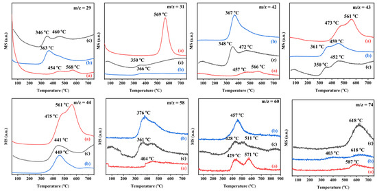 As shown in Figure 11, ethyl acetate temperature-programmed desorption (ethyl acetate-TPD) was performed from the 0.34AuPd2.09/TiO2, 0.33Pd/TiO2, and 0.36Au/TiO2 samples. Compared to the 0.33Pd/TiO2 and 0.36Au/TiO2 samples, the peak intensity of CO2 desorption from the 0.34AuPd2.09/TiO2 sample was stronger, indicating that a larger amount of ethyl acetate was adsorbed. The fragments with m/z = 58 and m/z = 74 were characteristic of propylene oxide (C3H6O) and methyl acetate (CH3COOCH3), respectively. Since m/z = 42 was another characteristic fragment of acetaldehyde, it shared many characteristics with the m/z = 29 desorption curve. Additionally, in the m/z = 31 desorption curve, the ethanol peak of the 0.34AuPd2.09/TiO2 sample displayed a higher intensity and temperature than those of the other samples, showing that 0.34AuPd2.09/TiO2 possessed a larger ethanol adsorption capacity. The 0.34AuPd2.09/TiO2 sample exhibited weaker peaks for the desorption of acetaldehyde, propylene oxide, and methyl acetate, further demonstrating that the formation of the Au–Pd alloy helped to decrease amounts of the by-products.