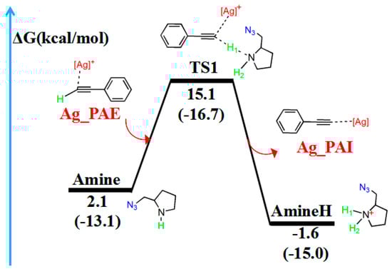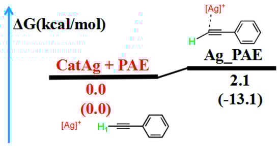 Reaction pathway of the addition reaction between catalyst CatAg and PAE. The relative free energy of the reaction pathway involving hydrogen is provided in kcal/mol. The relative enthalpy is also provided in brackets for reference (in kcal/mol).