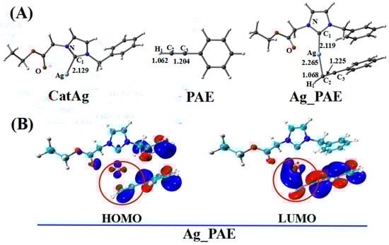 (A) Optimized geometries in addition reaction pathway between catalyst CatAg and PAE. Critical bond lengths are in Å. (B) Frontier orbitals of Ag_PAE.