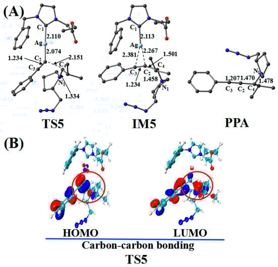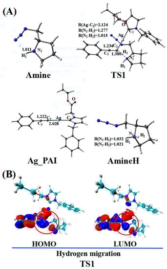 (A) Optimized geometries in the reaction pathway of Imine and Ag_PAI; the critical bond length is in Å. Hydrogen atom has been omitted for clarity. (B) Frontier orbitals of TS5.