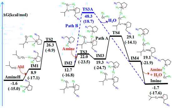 Amine–aldehyde condensation reaction pathway with (Path 1, in black) or without (Path 2, in blue) another amine catalyst. The relative free energy of the reaction pathway involving hydrogen is provided in kcal/mol. The relative enthalpy is also provided in brackets for reference (in kcal/mol).