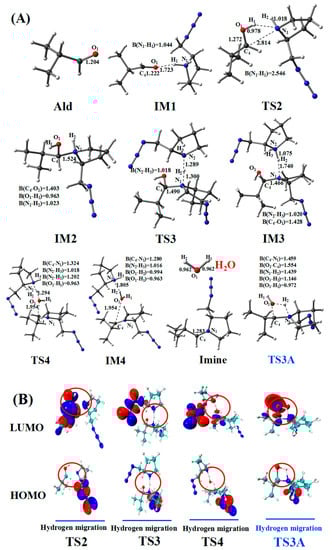 (A) Optimized geometries for the amine–aldehyde condensation reaction pathway; the critical bond lengths are in Å. (B) Frontier orbitals of TS2, TS3, TS4, and TS3A.