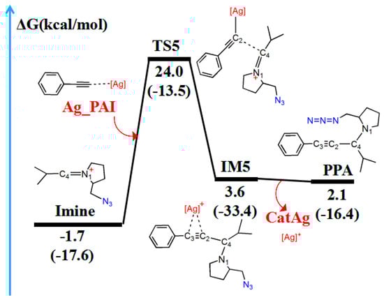 The reaction first forms a carbon–carbon (C2–C4) bonding transition state (TS5). The Ag–C2 (2.074 Å), C2–C3 (1.234 Å), and C4–N1 (1.334 Å) bonds in the TS5 configuration are longer than those (2.028, 1.222, and 1.283 Å, respectively) in the reactant (Ag_PAI + Imine). TS5 has a unique imaginary frequency of –134.8 cm−1, which shows the vibration characteristics of carbon(C2)–carbon(C4) bonding. The frontier molecular orbitals of TS5 showed their respective carbon–carbon bonding reaction characteristics (Figure 8B). The C2 px orbital appropriately combined with the C4 py orbital of the LUMO. The formation of IM5 subsequently occurred. The C2–C4 bond length decreased from 2.151 Å in TS5 to 1.501 Å in IM5. Thereafter, the Ag–C2 and Ag–C3 bonds break, releasing the catalyst components CatAg and PPA. The C2–C4 (1.470 Å) and C2–C3 (1.207 Å) bonds in the PPA configuration are shorter than those in IM5, whereas the C4–N1 (1.478 Å) bond is longer.