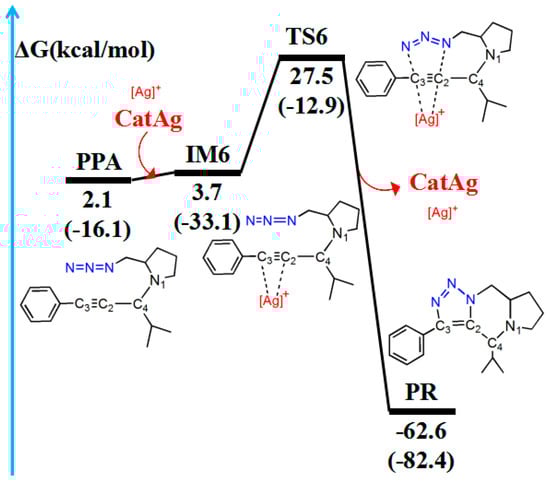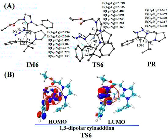 The CatAg first re-coordinates with the C2–C3 bond of PPA and forms the intermediate IM6. Because of the coordination, the C2–C3 bond (1.227 Å) in IM6 is longer than that (1.207 Å) in PPA by 0.020 Å. Immediately after the formation of IM6, the five-member cycloaddition occurs and forms TS6. TS6 has a unique imaginary frequency of –423.7 cm−1, which shows the vibration characteristics of a cycloaddition reaction. The frontier orbitals of TS6 exhibit their respective cycloaddition reaction characteristics (Figure 10B). Figure 10B shows the HOMO and LUMO orbitals of TS6. The C2–C3 bond π orbital interacts with the π orbital of the −N3 group in HOMO. Meanwhile, the C2–C3 bond π orbital combines with the π anti-bonding orbital of the −N3 group in LUMO. In the TS6 configuration, the C2–N3 (2.091 Å) and C3–N5 (2.243 Å) bonds are significantly shorter than those in IM6 (3.107 and 3.675 Å). Next, TS6 releases CatAg, thereby forming PR. Significantly, the C2–N3 (1.359 Å) and C3–N5 (1.370 Å) bonds in the PR are further shortened.