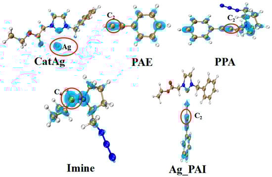 Table 6 and Figure 11 present the Fukui function data for certain molecules. The data illustrate that the Fukui function values (f+) of Ag (0.693) and C4 (0.212) atoms are the most significant parameters for CatAg and Imine; therefore, Ag (CatAg) and C4 (Imine) atoms have higher reactivity. At the same time, the Fukui function values (f−) of C2 in PAE (0.197), PPA (0.064), and Ag_PAI (0.172) are the highest. This indicates that the C2 atoms have higher reactivity and can easily react with Ag (CatAg) and C4 (Imine) atoms to complete the reactions. This result is similar to the experimental results [40].