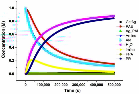 In order to better understand the intrinsic characteristics of the reaction and to understand the influence of the concentration of the catalyst (CatAg) on the reaction, the concvar program [44] was used. This program simulates the change in the concentration of various substances over the reaction time of the study and provides kinetic data based on the calculated reaction profile. Note that in order to facilitate the study, the reaction pathway was appropriately simplified, and some low-barrier transition states and insignificant intermediates in the reaction path were ignored. The initial concentrations of each of the three reactants (PAE, Amine, and Ald) for this simulation were set to 1.0 M and the catalyst concentration was set to 0.02 M at 333.15 K for 500,000 s. The concentration changes in each substance throughout the simulation process are shown in Figure 12.