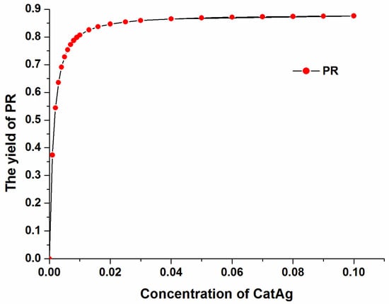 The yield of the product (PR) varies with the catalyst (CatAg) concentration at a constant reaction time of 500,000 s, as shown in Figure 13. The yield of the product (PR) increases with increasing catalyst (CatAg) concentration. In particular, the product (PR) yield increases rapidly when the catalyst (CatAg) concentration increases from 0.00 M to 0.02 M. After 0.02 M, the product (PR) yield increases slowly with increasing catalyst (CatAg) concentration.