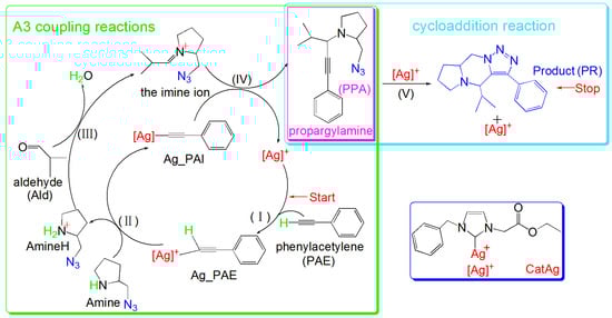In 2017, Cao et al. prepared recoverable N-heterocyclic carbene silver (CatAg) catalysts (0.5 mol %) to synthesize PPA; CatAg has high activity and can efficiently perform A3 coupling reactions. Additionally, the triple bond and −N3 group in PPA underwent a cycloaddition reaction to generate the final product (PR) with a maximum product yield of 92% [40]. However, the specific reaction mechanism remains unclear, and to the best of our knowledge, no theoretical research has been conducted on the A3 coupling reactions catalyzed by CatAg. Therefore, this study employed DFT calculations to investigate the catalytic mechanism of the A3 coupling reaction catalyzed by CatAg. Detailed research on the experimental mechanism will help us to understand the catalytic mechanism and provide new strategies for the synthesis of propargylamines. Scheme 1 shows a flowchart of CatAg catalyzing these reactions [40].
