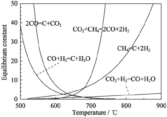 Zhang et al. [17] obtained the thermodynamic equilibrium constants of the above reactions as a function of temperature through thermodynamic calculations, as shown in Figure 1.