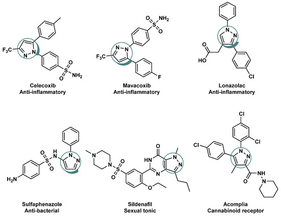 The pyrazole nucleus is essential in the pharmaceutical industry and represents an exciting scaffold for medicinal chemists [1,2,3,4,5]. Their biological activities include antimicrobial [6], antiviral [7,8], and anticancer [9,10,11] agents. Several FDA-approved and commercialized drugs in recent years have been derived from pyrazole derivatives (Figure 1), suggesting that this group is widely used in newly developed bioactive molecules [12]. Figure 1 shows that many synthetic pyrazole derivatives participate as anti-inflammatories in molecules, avoiding the side effects of known nonsteroid anti-inflammatory drugs (NASIDs) in which the anti-Cox2 receptor was identified to show significant analgesic and anti-inflammatory activity without ulcerogenic effect [13]. In addition, the prevalence of multi-drug-resistant microbial infections has become a global health concern. The development of effective antimicrobials with high activity and low toxicity is a continuous requirement [14]. A number of pyrazoles are capable of effective antibacterial action, such as sulfaphenazoles (Figure 1) and others containing trifluoromethyl groups (CF3) [15]. In addition, a fused pyrazole derivative, sildenafil, has been used to treat erectile dysfunction [16]. Moreover, some pyrazole compounds, such as Acomplia (Figure 1), that are used to treat obesity have a high affinity for CB1 cannabinoid receptors [17,18]. Due to the outstanding biological and pharmacological importance of pyrazole derivatives, many methods have been developed by medicinal chemists for the creation of new pyrazole-based drugs.