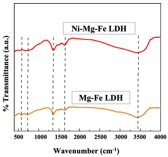 Figure 4 shows the FTIR spectra of the Mg-Fe LDH and Ni-Mg-Fe LDH samples, which had similar IR bands. The broad and strong signal at 3400–3450 cm−1 is the –O–H stretching band, arising from the interlayer water molecules and the metal-hydroxyl group [62]. The small and weak intensity band centered at approximately 1630–1639 cm−1 can be ascribed to the bending vibration of water H–OH–. The band at 1350 cm−1 can be assigned to the vibration of the interlayer CO32− and NO3− anions. The broad peaks at 550 cm−1 and 750 cm−1 could be assigned to the M–O, O–M–O, and M–O–M (M = Fi, Mg, Ni, Co, and Cu) vibrations [63].