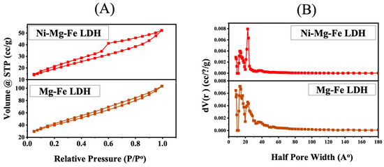 (A) N2 adsorption–desorption isotherms; (B) pore size distribution curves for the Mg-Fe LDH and Ni-Mg-Fe LDH catalysts.