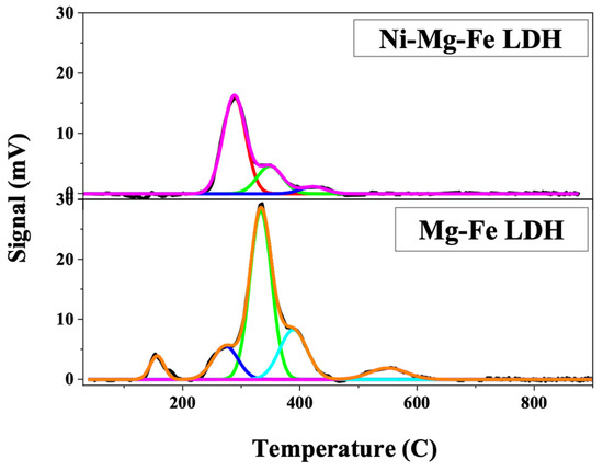 Thermogravimetric analyses of all of the samples are shown in Figure 2. The thermograms of the Ni-Mg-Fe LDH and Mg-Fe LDH were analyzed to obtain information on the percentage weight loss at different temperatures. The thermal decomposition of this hydrotalcite appeared to undergo a basic four-step mechanism, common to most LDHs [55]. In the Ni-Mg-Fe LDH, they showed two stages of weight loss, while the Mg-Fe LDH thermal decomposition showed three stages. In the Ni-Mg-Fe LDH, the first range of weight loss (64–214 °C), accounting for 13.2% of the total mass, is indicative of the removal of physiosorbed water and of the interlayer of water molecules (i.e., dehydration). The second range of weight loss (214–358 °C), amounting to a further ca. 14.05% of the total mass, is attributed to the removal of OH− groups and the decarbonation of the carbonate anions present in the interlayer space of the LDH, leading to the formation of metal oxides [55,56]. In the Mg-Fe LDH, the first range of weight loss (44–209 °C), amounting to 13.43% of the total mass, is indicative of the removal of physiosorbed water and of the interlayer water molecules (i.e., dehydration). The second range of weight loss (209–452 °C), amounting to a further ca. 17.28% of the total mass, is attributed to the removal of OH− groups and the decarbonation of carbonate anions present in the interlayer space of the LDH, leading to the formation of metal oxides [57].