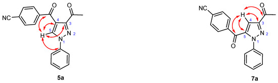 Table 3 shows the excellent yield of the obtained product (98%) attained using the Ni-Mg-Fe(III) LDH as a catalyst at 80 °C under ultrasonic irradiation for 15 min. (Table 3, entry 3). In addition, the product was obtained via the other LDH catalysts in good yield (Table 3, entry 2). Next, the best catalyst was tested at 0.15 g under the same reaction conditions, which did not reveal any superior efficacy (Table 3, entry 4). In addition, under ultrasonic irradiation, no product formed without a catalyst (entry 1). All reactions were performed under silent reaction conditions (without ultrasonic irradiation) (Table 3). However, a lower yield and long reaction times were noted under conventional reaction conditions, thus proving the significant effect of ultrasound on the synthesis of pyrazole in the present methodology. In addition, the effect of different solvents was tested to address the beneficial impact of CPME in this reaction (Table 3, entries 5–7). It is worth mentioning that CPME was an effective solvent for conducting the 1,3-dipolar cycloaddition reaction over the hazardous benzene, chloroform, or THF. Although the reaction yield in benzene was slightly higher than in CPME, the low vaporization energy of CPME makes it a good choice in ultrasonic reaction media, allowing for easy recycling of the solvent by the usual extractive workup. It is crucial to find a rationale for the enhancement effect of the ultrasound irradiation on the above reaction, since the reaction proceeded under silent conditions, resulting in a longer reaction time and a lower yield (entries 2 and 3). It has been established those heterogeneous catalytic reactions, such as those investigated between solids and liquids, are enhanced by mechanical effects that are caused by violent bubble collapse at the interface. Furthermore, shockwaves can break polar and nonvolatile molecules at the bubble–liquid interface. A competitive, simultaneously polar and radical pathway is considered plausible from this point of view. Ultrasonication usually results in an overall acceleration and a different product distribution when silent and ultrasonic reactions converge to the same product(s) [46], based on the well-established and reported spectroscopic procedure for 2D 1H-13C HMBC NMR (cf. supporting information) [68]. This reaction proceeded regioselectivity between the enaminone and the nitrilimine 3a (generated in situ), which afforded only one isolable product in each case, as examined by thin layer chromatography (TLC). The isolated product may be formulated as 5a or 7a (Scheme 1). Therefore, the formed product was identified as 5a, and structure 7a was ruled out (Scheme 1). Figure 7 shows the diagnostic correlation between the pyrazole proton and carbons in each case, although for both suggested structures, 5a or 7a, a four correlation for the pyrazole proton appeared with carbons, the regioisomer 5a showed a correlation with one carbonyl function group. On this basis, we ruled out the other regioisomer 7a.