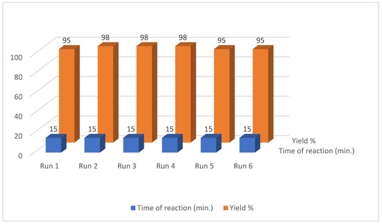 The recyclability of the prepared catalyst, Ni-Mg-Fe(III) LDH, was also studied via filtration each time and reused after drying for the model reaction. It was observed that the catalyst could be reused up to six consecutive catalytic cycles without any significant loss in activity (Figure 9).