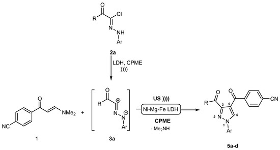 A tentative mechanism was proposed for the above reaction in which the creation of novel pyrazole derivatives 5a–d were supposed to be formed via initial 1,3-dipolar cycloaddition of the nitrilimines 3a–d (liberated in situ by the action of the large surface area, porosity, and basicity of the Ni-Mg-Fe LDH catalyst, causing dehydrohalogenation (−HCl)) (Scheme 1) to the stimulated double bond in the enaminone 1 to pay for the non-isolable dihydro pyrazole transition state liaises 4, tracked by the elimination of dimethylamine (improved by the reaction with the inattentive HCl), yielding the pyrazole derivative 5a–d.