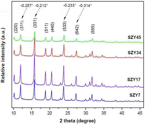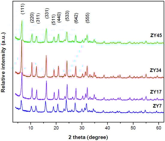 The average crystal (L) was estimated from the reflection of the plane (331, considering the Scherrer equation. The average crystal sizes were 19.6 nm, 31.4 nm, 31.2 nm, and 16.1 nm for the ZY7, ZY17, ZY34, and ZY45 zeolites, respectively. Similar results were reported for a series of steam-dealuminated Y-zeolites [].