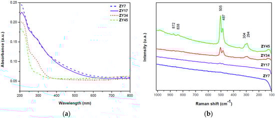 The Raman spectra of the Y-type zeolites are presented in Figure 2b. The zeolite with a Si/Al atomic ratio of 7 did not show bands, while the sample ZY17 displayed barely noticeable bands at 505 cm−1 and 487 cm−1. Both bands were intense for the ZY34 and ZY45 zeolites, and further bands at 872 cm−1, 838 cm−1, 304 cm−1, and 294 cm−1 were also displayed. The bands between 200 cm−1 and 400 cm−1 are attributed to the low-frequency torsional modes and the cation-oxygen modes. The strong bands between 300–600 cm−1 are associated with the type of rings in the zeolite structure. Y-type zeolites with high silicon contents show bands at approximately 490 cm−1 and 500 cm−1, attributed to the Si-O-Si bond angles and involving the mixed vibration of stretching and bending of the O atom [,,,]. The bands at 873 cm−1 and 839 cm−1 were assigned to the displacement of Si atoms bonded to four O atoms, besides the stretch vibrations of the Si-O bonds [,].