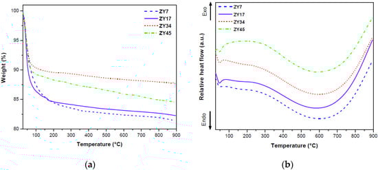 The differential thermal analysis (DTA), shown in Figure 4b, exhibited endothermic behavior of the samples at temperatures below 150 °C, typical of a dehydration process, and consistent with the loss of physisorbed water. Further temperature increase resulted in the progressive decrease of heat flow, attributed to the release of OH-groups up to 600 °C.