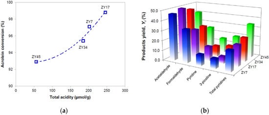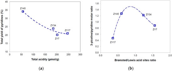 It is noticeable that the total yield of pyridine bases followed the order ZY7 < ZY17 < ZY34 << ZY45, following the total acidity of the catalysts, except the ZY45 zeolite that exhibited the highest yield of pyridines but the second highest acidity among the samples, as shown in Figure 8a. The total yield of pyridine bases followed the order ZY7 < ZY17 < ZY34 << ZY45, similar to the total acidity of the catalysts, as shown in Figure 8a. The catalytic activity of zeolites depends on several factors, such as the concentration of sites, their acid strength, and accessibility for reactants. The acid strength increases with the Si/Al atomic ratio. The acid strength of zeolites in this study may be assumed more or less constant. Since the BET areas of the zeolites with Si/Al atomic ratios between 7 and 45 are similar, the accessibility of acrolein to acid sites was also similar among the catalysts. As consequence, the total acidity was the most significant property for the conversion.