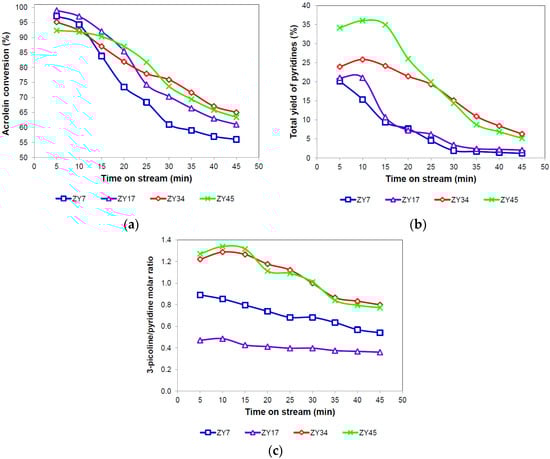 The compounds identified at the output stream from the reactor were acetaldehyde, formaldehyde, pyridine, and 3-picoline. For all the catalysts, acetaldehyde was the major reaction product (Figure 7b), which is in agreement with the literature where acetaldehyde is reported as a cracking product of acrolein over acid catalysts [,]. The total yield of pyridine bases (pyridine + 3-picoline) improved from 20.2% to 34.2% with the change of the Si/Al atomic ratio from 7 to 45. Pyridine was produced with yields of 10.7%, 14.3%, 13.2%, and 15% with the ZY7, ZY17, ZY34, and ZY45 zeolites, respectively. 3-picoline achieved yields of around 9.5%, 6.7%, 13.2%, and 19.1% in the same order. These low yields can be attributed to the low reaction temperature, and low NH3/acrolein molar ratio in the feed since it is known [,,,,,,,] that the increase of both variables improves the formation of pyridine compounds and typical reaction conditions for the synthesis of pyridines from aldehydes and ammonia are T = 400–475 °C, NH3/acrolein molar ratios between 4 and 6, as well as the reactant diluted with water.
