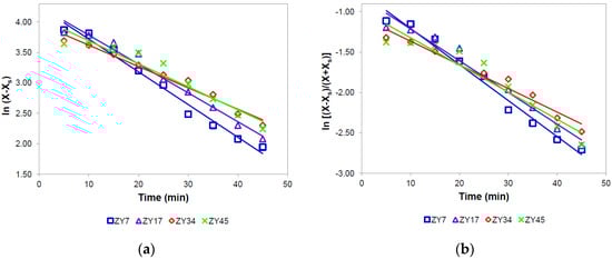 The minimization results presented in Table 2 showed that both models provide reliable results for all the catalysts. However, the second-order model provided a better fit (lower SSR and higher R2 values) than the first-order model, in agreement with the literature [,,].
